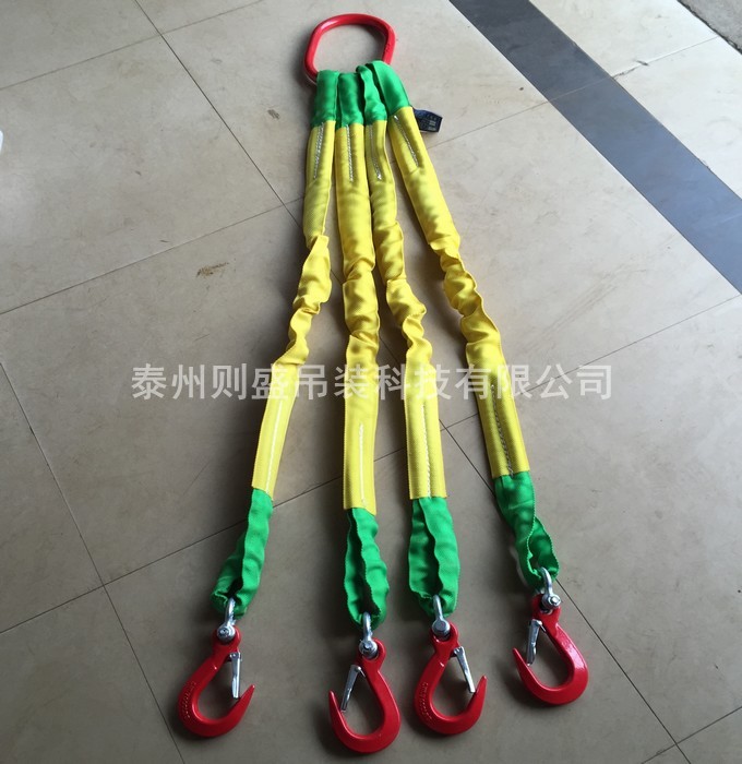 2、兩根吊裝帶作業(yè)時,將兩根吊裝帶直接接入雙鉤內(nèi),吊裝帶各掛在雙鉤對稱受力中心位置,四根吊裝帶使用時,每兩根吊裝帶直接掛入雙鉤內(nèi),注意內(nèi)吊裝帶不能產(chǎn)生重疊和相互擠壓,吊裝帶要對稱于吊鉤受力中心